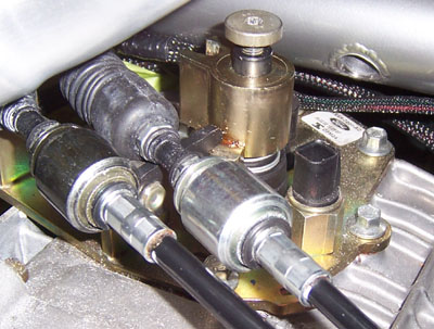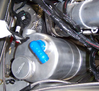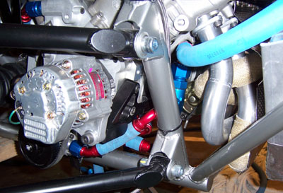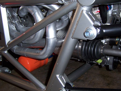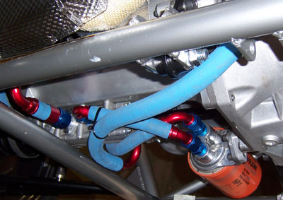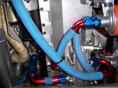 Of course drag reduction is not all that important when you've got over 375hp on tap, but what the heck. It's one of those things that's fun to play with because it's easy, cheap and visible. On a side note, after seeing the AirTabs on DarkHelmet, my friend David said he'd be ashamed to be seen in that car. I guess this means he won't be asking for a ride in Bikini either ;) 03/15/07 Even though it's been almost exactly a month since the last update, I've actually been working pretty diligently on this beast for the last week or so. The task at hand is plumbing and it's a major pain. The drysump scavenge circuit in particular - there are three scavenge stages, two are manifolded internally into a -12 outlet, the third is by itself with a -10. So the outputs have to be brought together in a very confined space into a single -12 line and then connected to the aluminum pipes that run in the chassis to the forward-mounted cooler. I'll need to do more exhaust shielding where the line exits the manifold. Also, while the Aeroquip push-lok fittings may sound cool (just push the hose onto the barbs), the reality is that they are a major pain. The smaller -10 stuff I managed after a few attempts, but the larger -12 was a definite no-go. I got Joe to stop by and asked him to try. He tried for about half an hour and came to the same conclusion. So I took it back to Oil Filter Service, the shop where I get all this stuff, to have them do it. No problem, took all of 5 minutes. I asked if they have a tool or machine for it. "Nope, we do it like the customers do, by hand. We're just used to it". Hmm... These guys must work out a lot. Well, got it done and that's what matters. In keeping with the tight clearance theme, the line from the filter to the engine clears the CV joint by 1/4" or so. It does clear, so as long as it doesn't move when pressurized I'm good.