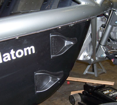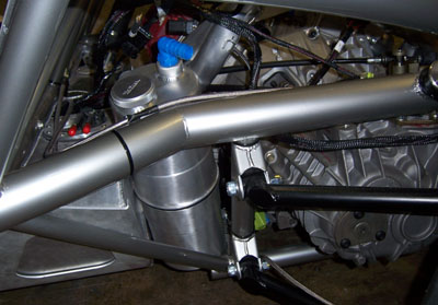 Yeah I think I like it this way. Now, back to more detail work. So much remains. Good thing I have another two months before the first trackday of the year. 02/17/07 I've been busy with work projects lately which is setting the car efforts back some, but today I made it a point to do some work on Bikini. The plumbing is a continued challenge, with much fiddling, hunting for fittings, hoses, clamps, etc. The good thing is that much of what I learn here will apply directly to the production dp1. One thing that won't apply, but needed figuring out anyway, is modifying the oil tank to fit. I was trying to come up with all kinds of fancy ways to indent it for frame rail clearance. Then I decided to just try a hammer. If it didn't work I could always go the cutting-and-welding route. To my great relief, the hammer worked well and it was pretty easy too. You can see where the dent fits the frame.