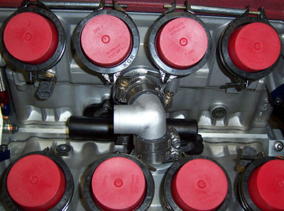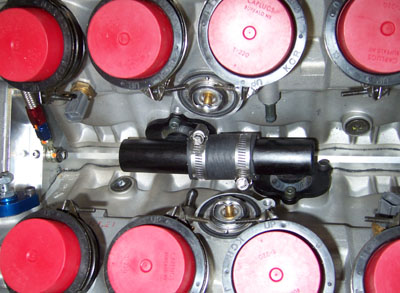 The oil tank itself is actually on the smallish side for the application, only 5" in diameter which makes it about a gallon in capacity. However I should have another 2-3 quarts in the cooling circuit and the fact that the scavenged oil goes through the cooler should help de-aeration. The fact that the cooler is actually a radiator should help as well. I'll need to keep a close eye on oil pressures though, especially since back-pressure through the cooler is a potential concern as well. I will most likely set up datalogging for engine pressure, scavenge pressure and temperature so that I can see any spikes in either direction. Brammo had developed a pretty neat drysump tank solution that integrates quite well and they did a lot of testing with it. Unfortunately it is located in the area that I want to play with aerodynamically so I'd rather avoid going that route, at least for now. But it's always a possible solution to fall back on. The other thing I did was install the thermostats and the cooling manifolds. Given the confined space to work in it's much easier said than done. But done it is, now, with minimal blood drawn (some).