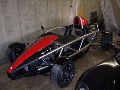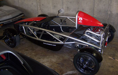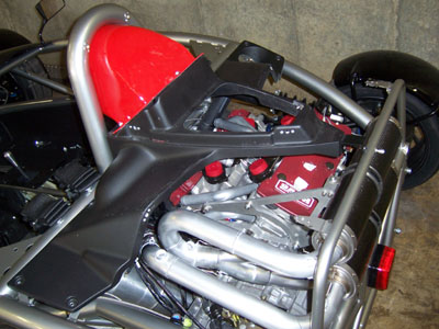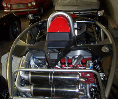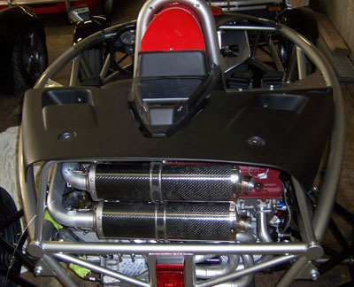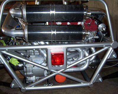 The filter is very big and very orange. Once I use this one up I may change to something less conspicuous but the good news is that pretty much any replacement I'm likely to find is going to be smaller so it'll fit just fine. Now I need to do the plumbing. Well, after I modify and mount the drysump oil tank at least. While staring at Bikini and thinking about driving and warmer weather, I recalled my recent (very cold) ride in John's Lotus 7 powered by a smaller (2.6L vs 2.8L) version of this motor. There was wheelspin everywhere and it was clearly too much motor for the car. I did drive it but did not want to push it even a little. My focus was instead on seeing how the engine behaves at lower speeds and it's perfectly tractable and linear with no ill temper. Pulls cleanly from 2K RPM. So the point is, with a 60% rear weight bias Bikini might utilize the motor better (once I get bigger tires on the back, at least) but it'll still be a SCARY car. One that will take me a while to work up to using anywhere near full capability. Which of course leaves the dp1, with 30% less weight and AWD... :) I think Bikini will be a nice set of training wheels for that. And speaking of dp1, there is good progress on the production chassis and some interesting aerodynamic developments. Should do an update one of these days.... 01/2//07 Some more progress on getting Bikini ready for spring. Mostly spent the day fabricating various plumbing fittings - both oil and water. Laborious but hardly picture-worthy at this point. They will be once installed. I did figure a lot of it out - the various parts I still need, where the electric water pump is going to go, how the oil lines will connect to the oil cooler, etc. More of the same tomorrow. One visual thing I did was test-fit the rear body panels on the car now that the exhaust is sort-of in. The rearmost 'tea tray' would have to be cut pretty extensively so I might as well just leave it off - it's not like it does much anyway except restrict access. Besides, the mechanicals under it are neat looking and will be even more so once throttle bodies are on.