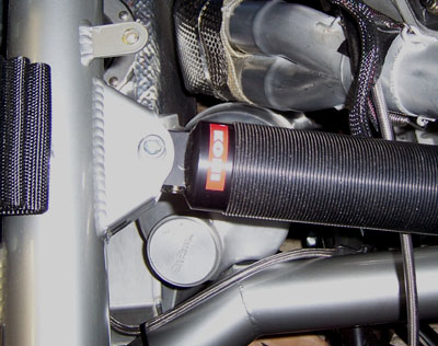 Little by little it's coming together. Still no flash of inspiration on the shift linkage but I'm about due for one. First trackday is March 24 so I need to have Bikini running and break-in completed by then. Or at least that's the goal. Gives me two months for the former and three weeks for the latter - should be doable. 01/11/07 With the rare snow on the ground it's hard to think of trackdays and driving this beast... But that's exactly what I've been thinking of lately and to that end I did a bit more work. I now have a general idea of what I'm doing with the shifter linkage (after staring at it for over two hours and moving things this way and that). It's not perfect but should be quite functional and reasonably clean. I'll do it in CAD first, then figure out the best way to have it made. A few days ago I got the oil filter bracket from Hartley so today I test-fit that. Works well.
