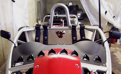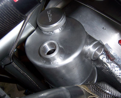 Unfortunately the cables are not the ideal length and bending them increases the friction in the mechanism considerably. So I really need to solve this 3D puzzle. Have some ideas already, they should gel enough for initial CAD in a day or so. Having the gearbox CAD from Ford really helps. Also, I spoke too soon on the DMV issue. There's a new twist (as in the policy change was made three weeks ago!) that is for the moment a show-stopper. I will eventually find a way around it, with luck, and I am pursuing one path with a couple backup plans on standby. Gotta love bureaucracies. 01/03/07 With much of the attention being directed to dp1 the progress on Bikini has been slow. Today I finally test-fit the oil tank. As with just about every single part in this project, clearances are tight but fit it does. Barely. I may modify the top part slightly to make it fit better. Good thing it comes apart, this allows me to install and remove it without dismantling the exhaust. If the fuel tank hadn't been moved forward for exhaust clearance the oil tank would not have fit at all.