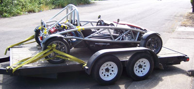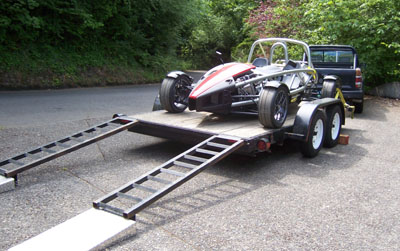 06/02/07 Well, it's time to get back to work on Bikini. To this end I've decided to move the car to the garage at the house for easier and more immediate access. The lift will be a help too. The trip was easy - loaded up (this is becoming a routine now), trailered to the house, unloaded.