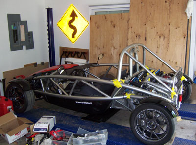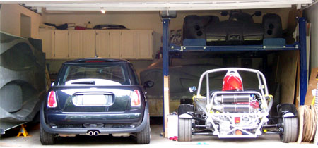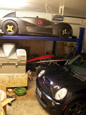 I definitely need to clean up the garage. This will be a good excuse to do it. Out in the open the car looks pretty neat, it's good to see it from a distance. The rollbar is definitely going to get powdercoated flat black. Over the past month there has been some steady progress on details - connected more plumbing, got a new oilpump belt tensioner pulley made, etc. I have this coming week to make some real progress after which it will have to sit until July. Such is life. 07/13/07 It may not seem like there's much progress but there are actually lots of things going on, some of which are pretty exciting. The dp1 has finally proven to be enough of a resume that I now have a design project for a bonafide automotive client, paying real money even. A few discussions are also taking place regarding moving the dp1 project forward and its future, although nothing is set yet. In the meantime, one of the many changes in my life is that I have lost the shop space where the dp1 was built so after coming back from Europe I had to scramble to try and find an alternative. Nothing useful came up in the two weeks so yesterday I had to move everything into the garage - the dp1, the buck and the mold. Of course the Atom and the MINI were already in it. The move was quite an ordeal because the buck in particular is very heavy and hard to maneuver without a forklift. But hey, I'm an engineer so I figured out the ways and means. Took from 10am until 4am this morning to get everything moved, get the garage cleaned out and organzied (somewhat), take the mold apart and figure out where to put the various pieces. But in the end it all fits - barely.