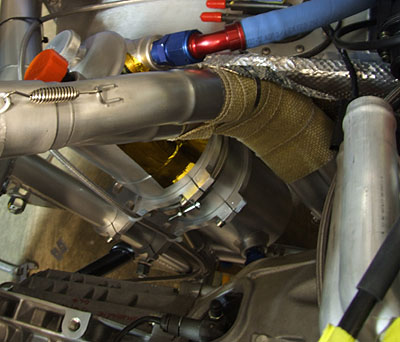 Finishing up the water plumbing is next. After all the rest of the sundry bits are in, some additional exhaust shielding will be in order. 08/28/07 This is turning out to be a real race against time. To help, John is flying down tomorrow to assist with the startup. In the meantime there is some progress. The shifter is back from the platers and installed. Looks completely like a factory part. It's a little hard to take a decent picture of it so the one below will have to do. It works quite well, too.
