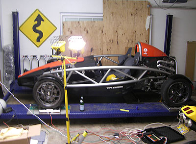 First thing I did was weigh the car as it sits, complete with all fluids and about 6 gallons of fuel. The only thing still missing is the rollbar which will add another 20 lbs. Gas is about 40 lbs of the total, so figure 1,250 lb empty 'curb' weight. Not bad for a 400 hp V8 - about same as a '70s F1 car :)