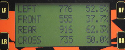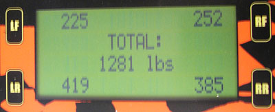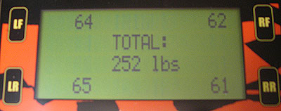 So all in all call it 70 lbs, approximately. Which is actually not too bad - I was expecting more. What matters is not the absolute number but rather the sprung/unsprung ratio. Taking the 70 lb per corner number as a reasonable approximation makes for 280 unsprung and about 1,200 sprung, with driver and fuel (which is what matters). So about 4.25 sprung/unsprung ratio which is OK for a light car but not stellar. In comparison, the dp1 has 41 lbs unsprung per corner and is about 1,100 lbs with driver and fuel, so 936/164 is about 5.7 ratio - inboard brakes help, as does emphasis on weight reduction. A typical 3,000 lb sedan with OEM 17" wheels and tires has roughly 110 lbs per corner unsprung so the ratio is 2,560/440 or 5.8. The reason this matters is that from a dynamics standpoint, the sprung weight is what's pushing the wheels/tires down into the pavement. The unsprung weight is what wants to bounce up and down (just roll a wheel and tire over some bumps even at low speed and you'll see what it wants to do unrestrained). So the higher the ratio, the more control there is over the tires and therefore the contact patch. Explains why the Atom tends to bounce over bumps a bit. I just dialed in more damping, we'll see how it affects things. This out of the way I installed the new rodends and set the corner weights. With me in the driver's seat and fuel in the tank, the numbers look like this:
