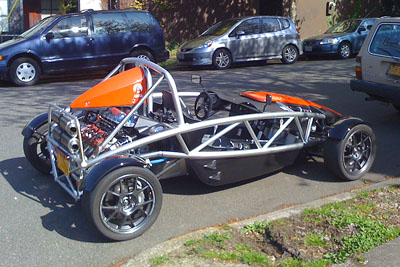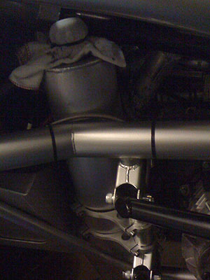 Looks good and should work well. The silver bar detracts from the lines of the chassis tubes, in my opinion, so I'm going to have it powdercoated black. I'm also going to paint the tube that goes above the mufflers black as well (it's being blackened by the exhaust anyway). Below is a picture of the car as-is and a photoshopped one showing approximately how it will look when done.