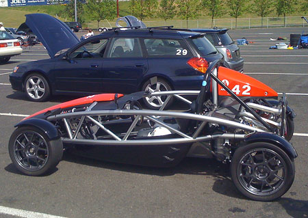 The bar is now at the powdercoaters, should be back next week. In the meantime there are several other things that need to be taken care of. The oil pressure gauge sender seems to have died (scared me for a moment but since I have two gauges and the other one was showing pressure I quickly realized that it's a gauge problem and not actual lack of oil pressure). A new one is on the way. I need to fabricate a shield for the oil pump belt, it's getting a lot of crud on it from the road and won't last long like this. Also a better venting setup for the oil tank is called for, right now I'm getting some oil spraying out from the vent cap. A better fire extinguisher mount would be good too, the cheap one I put in broke loose on the last drive (should probably get a halon extinguisher anyway). And finally I don't have a speedo sensor hooked up, need to get a connector and then probably do some calibration too. So quite a few things on the laudry list but all are manageable and some are getting done. 05/19/08 (updated 5/20) Finally a track outing for Bikini. Proper Bikini weather, too - nearly 90F. The rollbar is back from powdercoaters and installed, fire extinguisher is now Halon and the new venting system for the drysump tank is on the car. Time to see how well it all works.