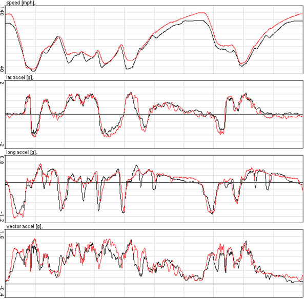 The flattening of the speed curve at the top is because I reach 7K rpm in top gear and just cruise from there. Peak forward acceleration is a bit over 0.5g even at this reduced pace. The car is FUN and the above lap was an easy 1:30.6, without trying hard at all, and was only the second lap in the second session. So there's much more to come - and much work to be done still. On with it then. UPDATE: After taking apart the drysump tank and making some changes to baffling (we'll see how it all works Friday I guess) I decided to belatedly make the obvious comparison - Bikini to dp1 prototype. The first set of traces below is the Atom (black) vs. early dp1 proto (red), basically first trackday to first trackday.