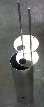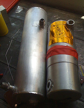 Just using the dp1 proto better yielded another 6.4 seconds and of course the car can do more. Notice that the dp1 now accelerates at least as well as the Atom and better in some places. And that's a 180 hp car, albeit about 400 lbs lighter. Vs 400 hp. Obiously I'm not using Bikini anywhere close to potential yet, so I think it's a 1:25 or better car even in my hands. Time will tell, of course. And then the dp1 will get an even bigger/more powerful v8, less weight, more downforce and proper racing slicks that it can actually heat up... ;) 06/19/08 I tried modifying the original dry sump tank to solve the issues but the bottom line is that it's just too small, which isn't helped by the fact that it has to be mounted at a 30 degree angle. So I went through a half-dozen alternative designs and settled on a tubular shape that's 5" taller at 18" vs original 13. Some searching on the web produced a nice 14GA, 15" tube and a few fittings. The rest of the bits would be cannibalized off the old tank. I designed a baffle system that would account for the tilted installation and Jared did most of the fabrication (I helped by making some of the parts but he did all the welding). Mounts had to be modified also and I did all of that. Took a few hours but the result looks promising...