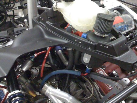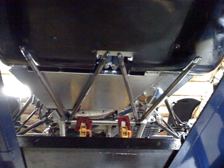 The fuel cell is mounted to the fiberglass tub but the brace acts as a safety backup to make sure that if something goes wrong with the mounts the cell doesn't drop down or drag on the ground. The brace also provides significant crush protection to the fuel cell.