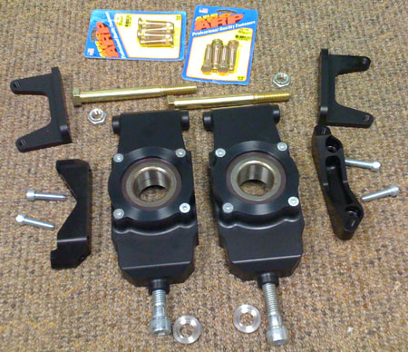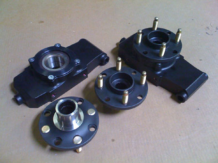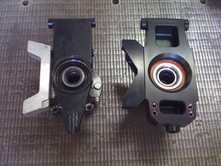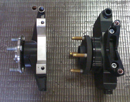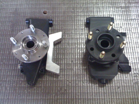 While things like this are getting done, the fuel map is totally messed up, at least in part due to the new fuel pump and the changes in plumbing. I've tried tweaking the map it but really haven't given it the proper amount of attention or time (too little of either to go around right now). So at the moment the car is essentially undrivable due to a combination of a tendency to die off-idle and a very grabby race clutch. I remembered this too late, after driving out to visit M at the track in the afternoon. The return trip in rush hour traffic was extremely frustrating and at some point I ended up stranded a dozen blocks from the shop, with no way to get going up the slight incline that the car had died on and with an exhausted battery. So Tristan had to come rescue me with the truck and pull Bikini back home. I will need to dedicate some time to tuning the map. The A/F gauge shows that the car is running very rich under most conditions, as rich as 10:1. So this will be another learning curve but hopefully one more skill will result when I'm done. It's very likely I'll rent some dyno time. There are a couple shops around here with DynaPacks which can hold set RPM under load. That should help with mapping. And yes, someday we'll get our own but not just yet. 05/10/09 We FINALLY got some US hubs. Only a couple so far but more are on the way. Delays aside, the parts are very nice and fit well. So in the coming week we'll actually be able to ship out some orders. Fancy that. Here are some pics of stock and replacement uprights, all assembled.