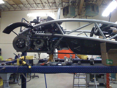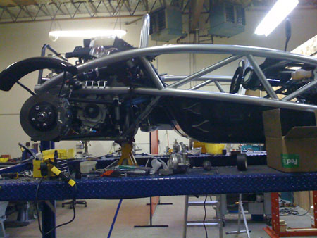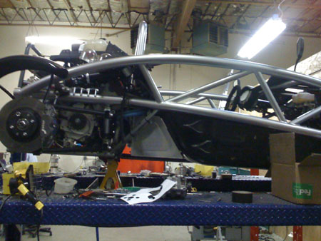 The two uprights with bearings pressed in, brake brackets (the parking brake brackets are optional) and hardware. The latter includes custom stainless safety washers for the upper arm rodends and ARP wheel studs (these will be pressed into the drive flanges). 04/11/09 Today we had the WHOLE crew working at the shop - Karl, M, Tristan, Jared and myself. And everyone got a lot done. One thing we got done is building the chassis brace. Once that is in place the fuel cell can be mounted (we had to make sure it will clear the brace tubes). Without a fuel tank the chassis really looks like it's missing something (it is).