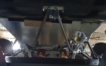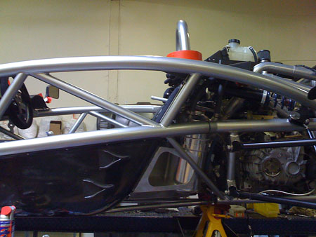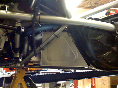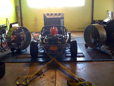 There are two more tubes that make up the brace which still need to be installed. Small portions of the fiberglass tub are cut away to expose the underseat tube to which the brace is attached. In the last picture above you can see how the fuel cell is offset to the side to make room for the oil tank next to it and it illustrates why the oil tank mount had to be of such odd shape. More on the progress tomorrow. There should be updates on dp1 and dp1/e also. 04/15/09 The hubs still aren't here (but supposedly on the way) so we put Bikini back together with the stock uprights and drove it today. The chassis brace is now in. It'll get powdercoated when we do the dp1 suspension arms in a few days. The fuel cell is also in and fully plumbed.