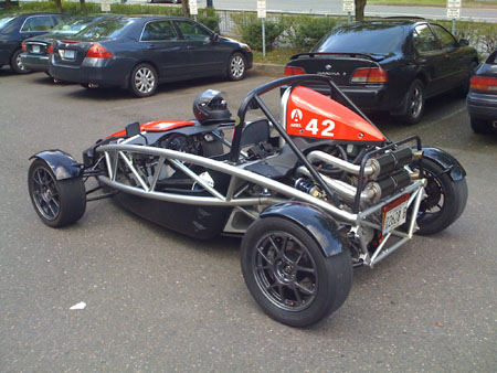 Bikini's advantage is clear - 15mph more speed at the end of the straights (145 vs 130). The handicap is also obvious - low cornering speeds. I could not get any heat in the tires and the rear camber being off made for some interesting exercises in throttle control and yaw control under braking. The bottom trace, time slip, shows that Darin was actually 0.8 seconds ahead at the exit of the esses but lost it all to acceleration difference on the back straight (and braking into turn 10, where the cursor is). What this means is that once the car is fully sorted I should be able to circulate the track at a pretty decent pace :) In the meantime there are a few maintenance items to be taken care of before our own event at ORP next week. No rest for the wicked. UPDATE: the pictures below show what I mean about the rear camber... (thanks to Scott for the photography).