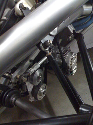 So quite a bit is now done, much more remains. Having tangible things to show for all the effort definitely helps motivation-wise. This will continue. 04/20/09 While M was off at the track putting the Mini through its paces, I was back at the shop getting UK upright kits ready to ship and finishing up some details on Bikini. Jared machined the second part of the belt cover and Tristan installed it (constantly giving me grief about the amount of tweaking required, but I expected this since the CAD models I have of some of the parts are approximate at best and there was no time to recheck everything). Works out OK in the end.