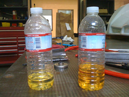 With the fuel cell came instructions to run a full tank and change the fuel filter. This is what we did (easier said than done due to some inexplicable quirks in the fittings that Brammo supplied). The odd part is that the gas that was in the filter is significantly discolored from what regular gas is (the Atom sample is on the right in the picture below).