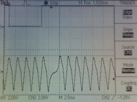 Oddly it also doesn't smell much like gas and more like cheap perfume. This may be a contributing factor to the drivability issues, although I have no idea what would cause this. Just to be safe we drained the whole tank and will refill it with fresh gas in the next couple of days. Dyno time for mapping is scheduled for next Thursday. 05/21/09 This update is the culmination of qute a bit of work actually. As I had mentioned previously the Atom had some serious drivability issues and wouldn't start when hot. I thought I could fix it with fuel mapping but when we loaded it on the dyno at the appointed date a week ago it just refused to run once warm and the one time it did catch, kind of, it misfired badly and quit. We cleaned the plugs, replaced coils, tested injectors - all to no avail. So we packed it up and rescheduled for Monday. Over the weekend I spent more time tinkering with it - runs fine when cold, refuses to work once hot. After several phone calls to John to get ideas and tell him what was happening, he suggested it might be a crank sensor problem. With all the oil spray earlier and pulling the engine out it's possible something got messed up with the wire or the sensor itself. I dug out my scope to check the signal (haven't used that thing since electronics hardware design days). With engine cold at idle speed everything looks normal. The missing tooth is in the middle and the signal rises nicely across the gap, just like it should.