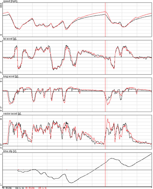 There were no further heat issues and the headers never glowed again even under full power. This does serve as a valuable lesson though and I've already redesigned (in my head for now) the heat management approach on the dp1. Bikini is intended as a tesbed and it's serving this purpose beautifully. I really couldn't have planned the learning experience better. So even though it's at times very frustrating, all this is just the necessary part of paying the dues that go with pushing the envelope. As such, a very good day. Finally. The oil even stayed in the tank. I'll get the power plot shortly and will post it then, but generally after messing with the fuel map a bit we got 330hp at the wheels at 9K RPM (I didn't want to push the redline but power was still going up at that point). Also, the dyno is supposedly reading a bit low at the moment. At any rate, we're at roughly 400 hp at the crank which is exactly what is expected, so all is well. The map definitely needed adjustment so it was time and effort very well spent - we gained over 10 hp in the process. John now has a dyno and will deliver subsequent engines that are closer mapped, but this was the first engine he built for a customer so I had to start with an approximate map from a different H1 with a different exhaust and intake. Now it's pretty close to what it should be. The torque curve is nice and flat, too. In a 1,250 lb car this is plenty :) Tomorrow is a Lotus trackday so we'll see how that goes. Wish me luck. 05/22/09 (updated 5/25) FINALLY. I've completed not just a couple laps but a whole 3 sessions at PIR! It only took something like 3 years to do it :) Now that the engine is healthy it's simply amazing. The power just keeps coming, very linear and controllable, and the soundtrack matches it perfectly. Yes, there are simpler ways to get 400 hp in a car like this but this is sweet. The dp1 with this motor will be off the scale. Of course with all attention being focused on the engine I've not taken any time to set up the suspension (rear camber is quite a ways off, for one). So the car skates through corners and totally rips on the straights, although getting a good drive out of the turns is easy and I can just squeeze the throttle on, sometimes even before the apex. Of course I need to set up the rest of the car and also recalibrate myself to driving it, but the result is pretty good even now - 1:21.9 best lap. This is the fastest I've gotten around this track, ever. And the car has another 2-4 seconds to go, I just need to figure out how. It's an interesting exercise to compare to the fast lap Darin ran last year in his 245hp Atom. Back then he posted a time of 1:23.15 which is quite a feat. The plot below tells the tale: