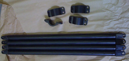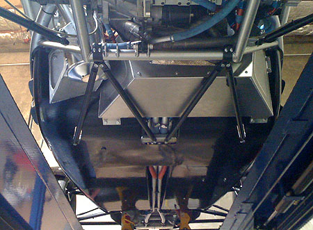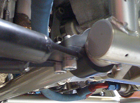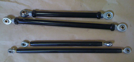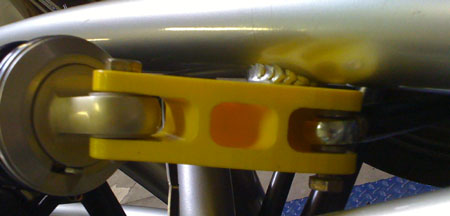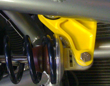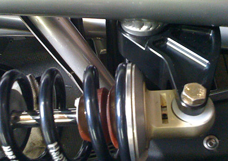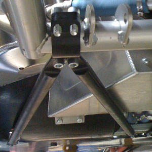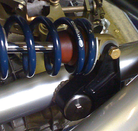 After reinstalling the brace and putting the harness back in, we turned the ignition on and fired the engine up. Started and ran with no issues - good, considering that every single wire on the engine side was either modified or replaced. We are going to weld up the new suspension pushrods tomorrow, then install the new bellcranks Thursday and we should be good to go. 07/24/09 The bellcranks are now anodized and installed, along with the new pushrods. The pushrods use 1/2" instead of 3/8" rodends and the rodends themselves are premium Aurora units. Bellcranks have roller thrust washers and a progressive linkage geometry.