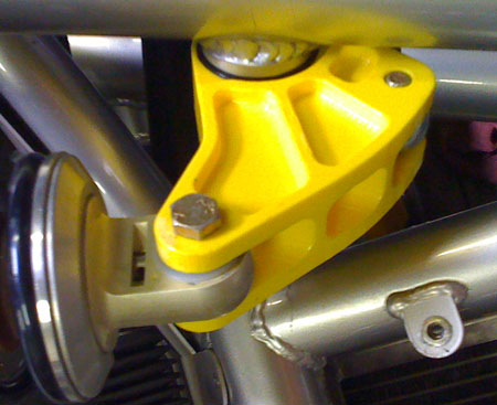 06/23/09 Having just come back from judging the FSAE student competition (see ETC page) really puts the Atom in perspective. The styling, as I understand it, was a student project by Nick Smart and it's nothing short of brilliant, a genuine milestone in automotive design and one that is certain to inspire many others. The engineering... well, let's just say there's room for improvement. Some of the stuff I saw at FSAE was truly impressive and out of 40-some cars present I didn't see a single regressive linkage on a suspension. I looked. (OK, to be fair I'm aware that some people involved with the Atom wanted to make things right but weren't given the opportunity). Anyway, back to the latest fix - bellcranks. I got the RP part and tried it out.