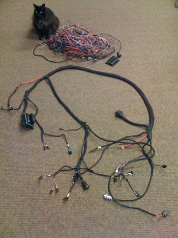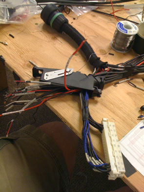 Turns out it's not a problem at all even in aluminum and as long as I design it without stress risers it should work fine. Mine of course would allow camber adjustment without disturbing the toe setting, unlike stock. So I'll most likely go for it. We'll see how long it takes. 07/21/09 As part of the tidying up that I'm doing prior to selling this beast, the engine side of the wiring harness got redone. Some of the original wiring was done in a bit of a haste and I didn't feel good knowing what state it was in, even though it's not visible. So I completely replaced the ECU connector, replaced all sensor wiring and generally cleaned things up. This harness will also serve as the prototype for the dp1 engine wiring so it was a good exercise in that regard as well.