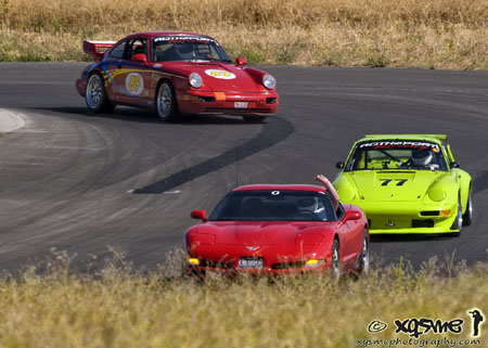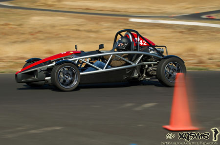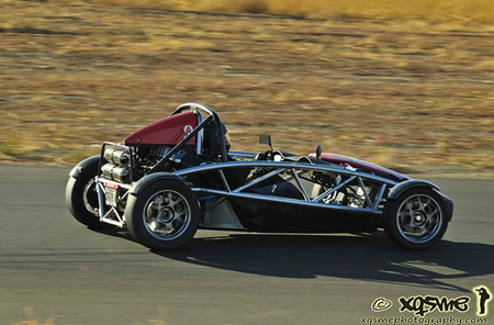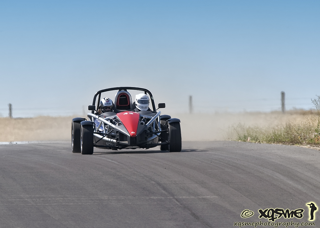 The car is now back together, ready for the track day on Monday. Should be a good test of all the changes. It's promising to be a scorcher, too - forecast says 97F. 07/28/09 A bit of a trial by fire - well, by sunshine at least. With temps around 102F (39C) our second track event at ORP is certainly a good test of the cooling system. Which worked fine - oil stayed at 210F (100C) and water never went above 200F (95C). One thing that didn't work, as it turns out, is the alternator. The car would start and run fine, then after a few laps just misfire and quit. Attempting to restart wouldn't even turn the engine once. So M and I got to sit in the sun for a while waiting for the session to end (I yelled to the nearest corner worker to keep it running, no point in depriving others of tracktime on my account and I was able to pull well off the track into a bypass). We got to become one with the heat. Here are a couple pictures courtesy of Xqsme Photography (click each for bigger version). I didn't guess the alternator at first, so after getting a tow back to the paddock at the end of the session I swapped the battery and the car ran just fine. At least for about half-dozen laps giving rides to corner workers and friends. Then it quit, making the nature of the problem quite evident. I didn't have another charged battery to swap in (borrowed the first one from the 900 which was OK with the drained one after a jumpstart from the truck). Well, another thing to fix. On the plus side, the bellcranks/pushrods worked really well. The new progressive rate makes the suspension compliant over small bumps/irregularities but really limits overall motion, in a controlled way. So the suspension now feels both firm and smooth at the same time. I like it, although I didn't really get to push the car hard handling-wise. Overall balance seemed pretty much unchanged. The trackday itself went well, with a good turnout despite the heat. On suggestion from Rob we tried running just two rungroups, cars and bikes, alternating 30-minute sessions. For maximum tracktime that's definitely the way to go - even with a couple minor delays we still got 7 sessions for each run group and over 3 hours of tracktime for everyone (or at least those who could last that long!).