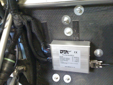 I've posted photos of this car before but this is the first time I got to see it fully out in the open, so what's a few more pix. It is ridiculously wide as are its tires. Funny part is, the Atom runs roughly comparable lap times. Speaking of the Atom, it is still having brain issues. Runs great for about 5 laps then starts misfiring. ECU data log says crank sensor errors (which could also be cam sensor errors). I've replaced the timing wheel and after the first session I replaced the crank sensor too. Same result. OK, well, we know what this ISN'T caused by. Cam sesor is next. After that will have to bite the bullet and swap the ECU. On the plus side, the oil problem is now officially solved and it's gratifying to see the car sitting there with not a drop under it. Some may recall how long that took to address. So the current problem will too be overcome. The annoying part is that the car runs fine for a while on the track and on the street the problem doesn't show up at all. So it's a bit hard to diagnose. Well, all this is character-building. I do have to say that while it's running well, the power is just awesome. I totally love this motor and can't wait for the first drive of the dp1 with the 500hp version. I did manage more than a dozen good laps and it was fun. Also, to test my suspension mods I purposely hopped a couple curbs - enough to see plenty of daylight under the front wheels which are in plain view of the driver. No issues, nothing bent and it didn't even feel harsh or like much of an event at all really. Just a bump. At least some things are working well. 09/19/09 The new ECU showed up a couple of days ago (a DTA S80PRO, a more modern and capable version of the old one). It is definitely a nicer unit and everything from features to the connectors is better. Still, I had put so much work into getting the old connector and harness wired up that it was a bit painful to just cut it. Had to be done though.