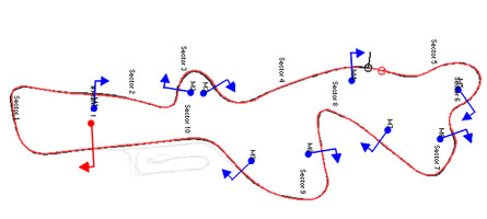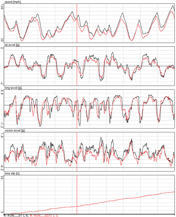 One of the many benefits of the new ECU is better diagnostic capability, it actually gives you an oscilloscope-like trace of the cam and crank sensors. Which helped solve several puzzles when the engine refused to start at first. It was easy to trace the issue back to the cam sensor (which I had replaced as part of the ECU upgrade) and after some tweaking I got the thing to fire up and run. The map from the old unit transferred right over with minimal adjustments so the Atom seems to be ready for next weekend. Hopefully this finally fixes it. If not, at least I would have better insight into what's going on. Overall the car is vastly better now than when it first ran. And I've learned a LOT. 09/29/09 FINALLY! The car works and works very well. Karl did the driving (some 200 miles on track) while I was dealing with the challenges of the event and quickly proved my earlier assertion that Bikini had at least another 10 seconds in it by turning a 1:51.8 lap (versus 2:03-ish best that I could manage in the few laps that the car actually ran previously). It is a good illustration of the engine's flexibility since Karl did the entire track in third gear! He thinks there's another 5 seconds or so to be had but neither of us was willing to try it, what with the car being for sale and all. Below, the black trace is Karl's and red one is mine.