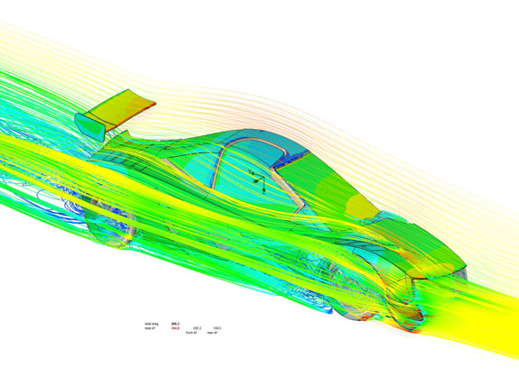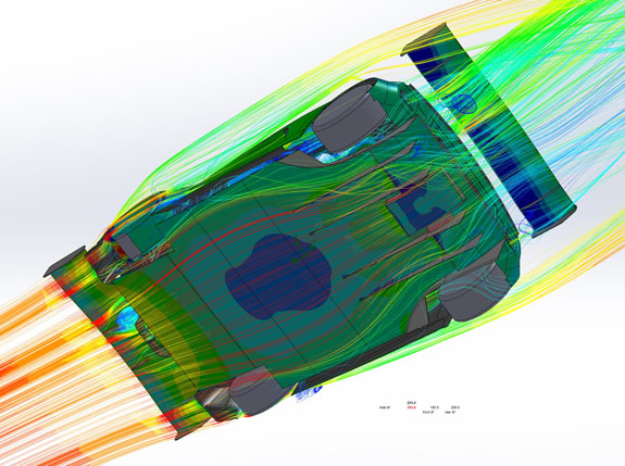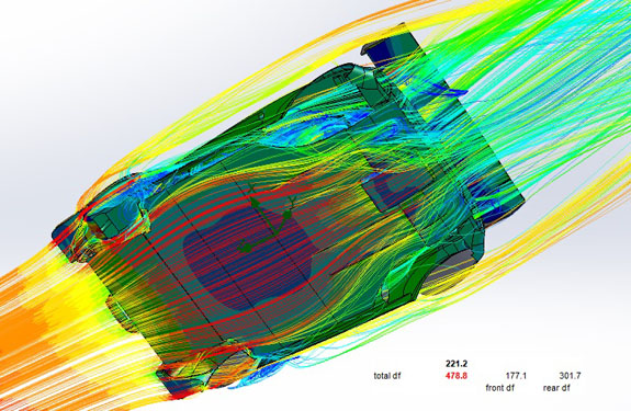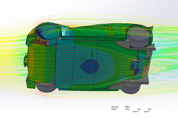 The last picture above is not smoke - we put a line of chalk powder on the ground and drove over it at 100 mph. That same year we got Solidworks Flow Simulation CFD package, and figured out how to set up the simulations so that the virtual results closely match the real world data, in several very different configurations. The thing to keep in mind with CFD is that it is still a simulation, so we treat it more as an extra insight and input into the design process rather than an absolute reference. The numbers are used for two purposes: one is to make sure they're ballpark realistic, just as a reality check on the setup and analysis. The other, primary purpose, is for A-B comparisons when making a single change. This is key - have to make one change at a time to see what effect it has. Which takes a lot of discipline since each run is 7-8 hours. So CFD for me is a weeks-long process, making a change at night and analyzing the results in the morning. All runs are made at 100 mph since that is a very relevant track speed, where aero starts to matter and some actual fast corners and crests are taken in that range. As a side note - the numbers below may seem low compared to what you see being claimed online. I've seen 1,600 lbs of downforce being claimed for a wing that is smaller than the one we use on the D1. The thing with such claims is that they are impossible to prove or disprove, because most often even the people making the claim don't have the instrumentation (wind tunnel or strain gages) to actually measure it. But some simple questions can often give you an idea of realism - the most basic one being 'at what speed?'. You'll be surprised at how often that question just draws a blank stare. Since aero loads vary with the square of speed, that is a very fundamental thing to know. Our wing that makes 200 lbs of downforce at 100 mph would make 800 lbs at 200 mph, but the car would almost never see that (stay tuned for the 'almost' part ;) ). I choose to quote 200 lbs because it's relevant and useful to someone trying to actually tune one of our cars for driving on a real track. It took a bit to figure out how to keep track of all of it, too, and I've settled on a combination of spreadsheet and series of pictures, with saved views, for each run. Some examples below - streamlines are colored by velocity, surfaces colored by pressure. Note particularly the size of low-pressure area on the floor and the progression from 175 lb of calculated downforce to 478. The flow lines are just as educational.