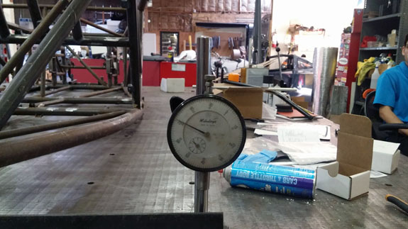 10/06/15 While Tristan and Jay are cranking out Drakans and I am working on the Stiletto and a couple other things, Mark has been setting up a D2 experiment. The goal is to test torsional rigidity of the chassis, then cut away the upper main tubes for ease of entry, then test again to see what effect the change has on rigidity. We set up our original prototype chassis for the purpose. The front is clamped to the iron table (at 25,000 lbs it makes a very stable reference surface!). In the back, a tube is placed under the cross-member to serve as a pivot. Elevating the back also makes sure that only the very front of the lower main tubes is on the table.