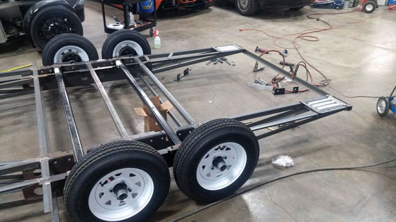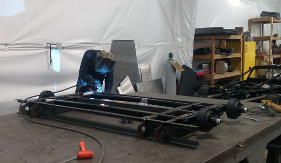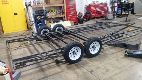 A fair bit of work remains and we'll run CFD on it as part of the process. But it should work. Once the design is finalized we're going to try casting a part and see how that goes. It'll be a learning curve. Another thing that's progressing is the new trailer design. The sheetmetal parts are now made and the construction of the first trailer has begun. As previously mentioned there are some very challenging design parameters, driven by customer requirements. the enclosed trailer can be no wider than 90" (the car is a little over 80" wide!), less than 214" overall length (car is 159" so not a problem there), car hast to be loadable by a single person, and height is a restriction as well. And the whole thing has to be towable by a RAV4, with car, spare set of wheels/tires, and at least 10 gallons of extra gas. I have most of the design figured out, though some things are still in flux (canopy mostly). It uses two Torflex axles rated at 2,200 lbs each with hydraulic surge brakes on both.