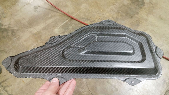 The above is just a random bit we did (will end up on Jay's Miata) - not for our cars but the original metal stamping provided a ready mold with some features. We tried two different layup schedules and learned something from each. Making a test D2 wing is next. It'll take us a few tries, no doubt.