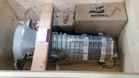 Like all our higher-performance versions, this car gets a Dailey drysump system with our own custom tank, oil cooler and all the fun plumbing. The Mendeola sequential transmission had arrived a couple weeks ago.