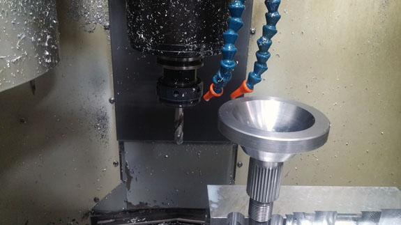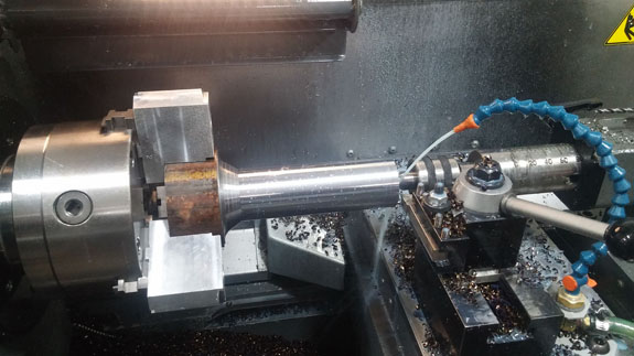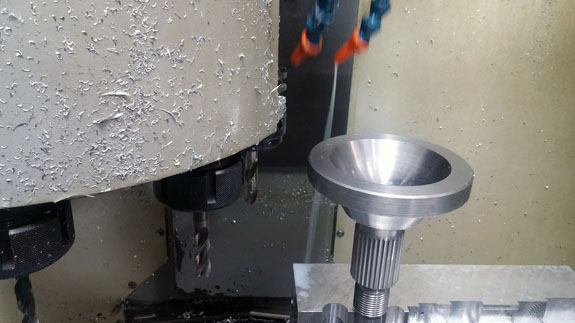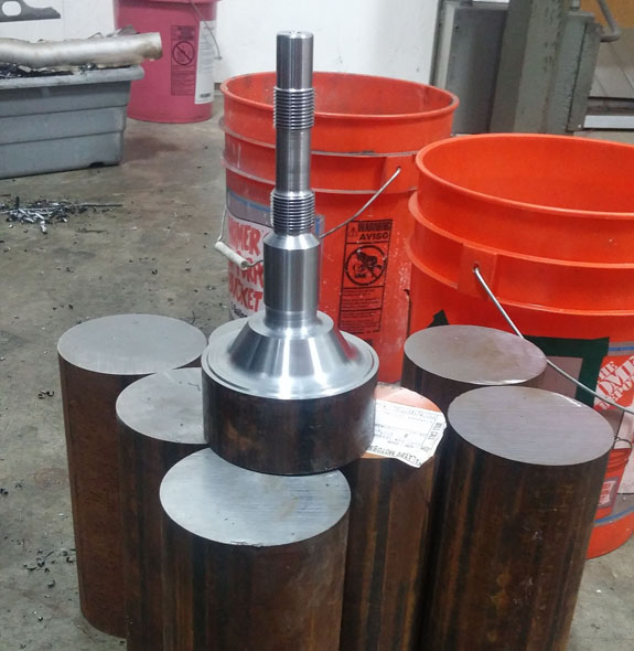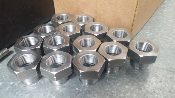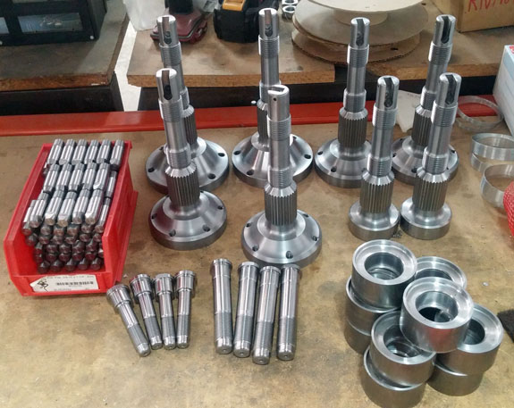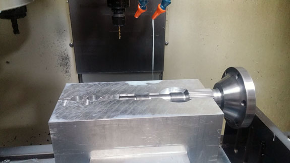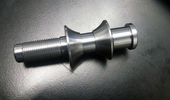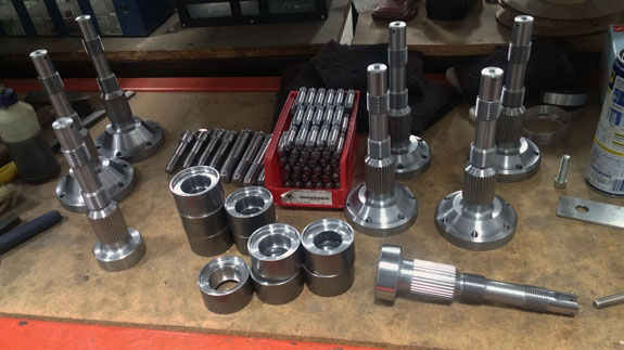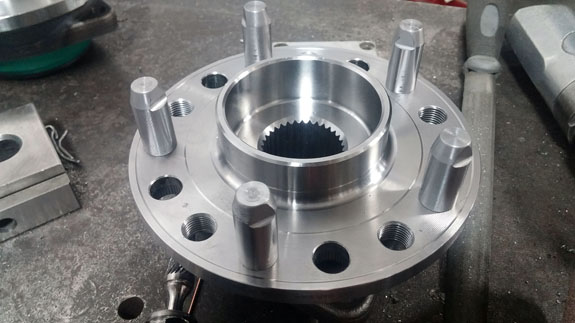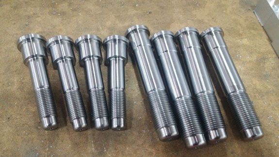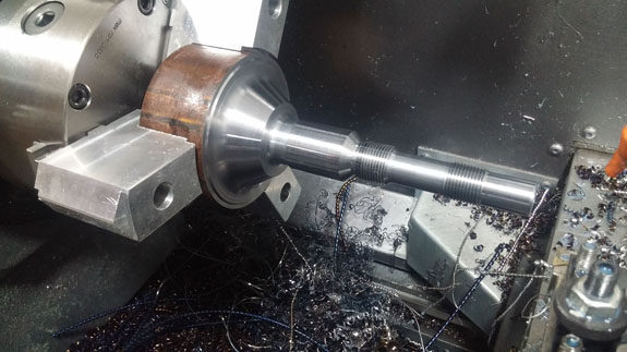 I may have mentioned that these have been some of the most challenging parts we've done machining-wise. The toughest of them are the stub shafts, which both transmit the torque from CV joints to the hubs and hold the wheels on. Our equipment is pretty compact so we're stretching the limits of its capabilites, and have to be both clever and very careful in the setup. Each shaft starts as a 47lb billet of alloy steel that is machined down to about 4 lbs in the lathe.