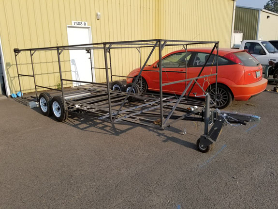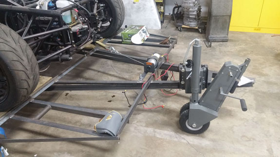 We've already gotten some customer feedback so the concept will continue to evolve. Some of the key goals are replacing the digital dash behind the wheel with analog tach/speedo, moving the digital dash to center console, providing HVAC vents and controls, and more flexibiltiy on digital/analog gage mix. Defrost is a necessity, and accommodating knees for drivers over 6'5" is desired. That, and making the whole thing look more refined, weatherproof, and functional as both coupe and (non-weatherproof) roadster. Easy, right? The trailer design and construction is progressing as well. We've made a solid mount for the Trailer Valet and have finalized 4-wheel tie down spots. Waiting for the surge brake assembly and will start on enclosed canopy shortly.