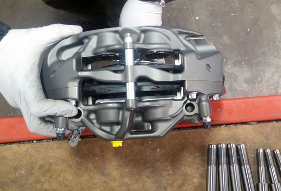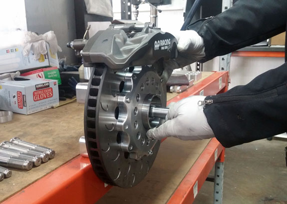 Some might notice that there are actually three kinds of shafts in the picture - large CV, medium CV and no CV. Subsequent parts we produce will have material sized appropriately and will significantly reduce the machining time, but since the mix actually changed mid-stream on this batch, we started them all as full billets. Yes, we recycle the chips. No, we don't get anything worth mentioning for them, it's more for the environment than any financial incentive. Like all our upright designs, the GTC has a large degree of modularity and we can accommodate a wide mix of geometries, CV joints and brake packages. The two current GTC customers are very different - one is an LMP style endurance racer powered by new generation Hartley V8, the other is the Envate Hypercar. The endurance guys are using AP Racing brakes: