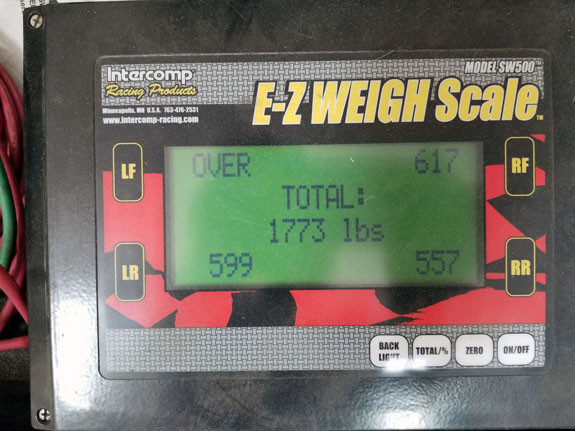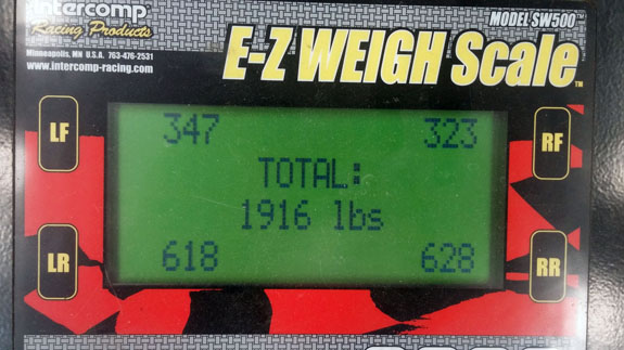 While setting corner weights without bodywork we saw total of around 1,900 lbs, it will be around 2,100 lbs with body on.