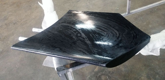 The CAD model doesn't show wastegates or blowoff valves, those will be added shortly. Parts themselves arrived a couple days ago. This is a mass airflow setup so BOVs will recirculate upstream of the turbos instead of venting to atmosphere. This car will get last year's prototype bodywork so at least that part is already done. We do need to fabricate new wings for it, and that's still a process. We've tried numerous resins, gelcoats, layups and processes. It's getting better but the test parts are still not coming out the way we want. This is exactly why we don't do structural composites - process is everything, and a lot of the time you don't know if the part is good or not without destructive testing. We're just not set up for it. However cosmetic and semi-structural parts like wings are within reach and it's our goal to get good at doing them. Here's an example of a recent part - you can see it has some dry voids along the weave. It starts saturated with resin, so it's not from lack of that. Something in the process draws it out.