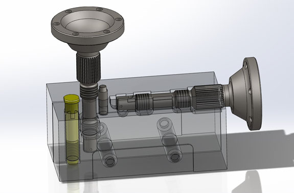 It then goes out for splining which we can't do inhouse. Next come the mill ops. One of the many challenges is holding the parts securely and precisely in several orientations (within 0.001" in XYZ). Below is a screenshot of the tooling jaws I designed for the job. They do a lot, including other parts that go into the upright package.