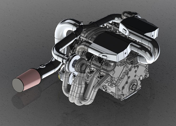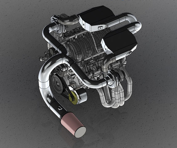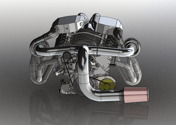 The Enviate uses an even bigger Stoptech setup with carbon rotors. I'll post some pictures when I have them. Keep in mind that the same upright will work on the D2 as well, with some suspension arm changes. If you have a build that could use them, let us know (we can do standard Corvette or 5x114.3 bolt pattern if centerlock is not necessary, at significantly reduced cost). And, the parts we've devleoped can be used to make a Corvette centerlock kit - HRE and Jongbloed can make the wheels to work with it. 5/9/17 Work continues at a crazy pace. The Twin-turbo D2 is currently the most time-critical but there are several other items that are just as urgent. One of the biggest challenges with the D2TT is the packaging - getting everything to fit in a way that is efficient and will work. As a bit of background, our goals for the system are quite different from most twin-turbo LS builds. While it's possible to get well over 1,000hp we're looking for 'only' 700 or so at the crank The catch is that we want to see that at 14,000 foot altitude and have instant spool-up for clean corner exits at Pikes Peak. So we've chosen smaller turbos than you'd normally see - GTX2867R. Each is good for up to 480hp so between the two of them, 700hp is still pretty mild. It's actually the same turbo we use on the Hayabusa-powered D4s and total gas flow is very similar - 1.4L 10K RPM vs 3.1L at 6.5K RPM for each half of the LS motor. And at altitude the operating point is right in the peak efficiency island on the compressor map. As an added twist, another goal was to make the system retrofittable to existing cars. We wanted to maintain MAF operation and original cold air intake location behind the driver's seat. The intake and exhaust plumbing compete for space with cooling system, oil systems for engine and gearbox, wiring and a few other bits.