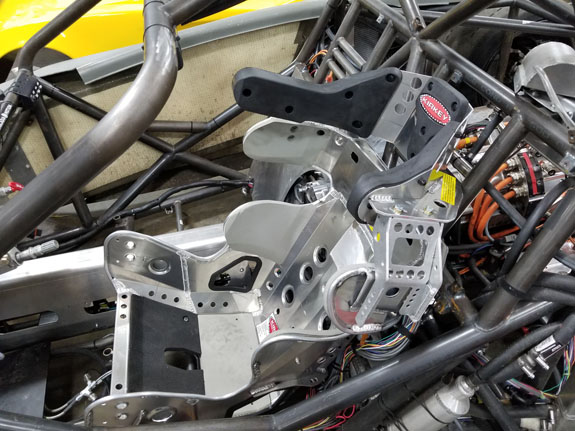 A while back I joined SCTA and got a copy of the current rule book. Going through it, the obvious list is parachute, tires capable of these speeds, head and upper body restraint limiting motion to 2", 11 lb fire system, steel driveshaft hoops, lexan windows, and probably some rollcage modifications. And swapping the diff gearing. A lot to get done in a month, but doable. A quick check of hotels and AirBnB shows that the nearest available lodging that isn't over $200/person/night is 100 miles away near Salt Lake City. That would make for 1.5 hour commute each way, each day. Not great but doable (people in some parts of the country do that every working day of their lives). So after discussions with Cascadia Motion, our sponsors and partners in these adventures, the decision is made to go for it. It'll be interesting. 7/12/19 From Pikes Peak experience I know that it really helps to reach out to the tech people in advance to try and limit race-day suprises. Which I did. A bit of time goes by during which I discover the only tires that will fit are Mickey Thompson LSR tires (at $740 apiece), but they will need custom wheels. After some dead end paths it turns out Forgeline can make us a set with the correct offsets that will clear the brakes and can be done in time. So orders placed for tires and wheels. It's a hefty expenditure so we're committed now! For driver safety we ended up ordering a Kirkey full containment seat, hoping it will suffice. It showed up a couple days later.
