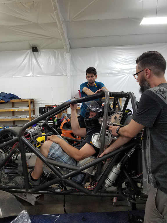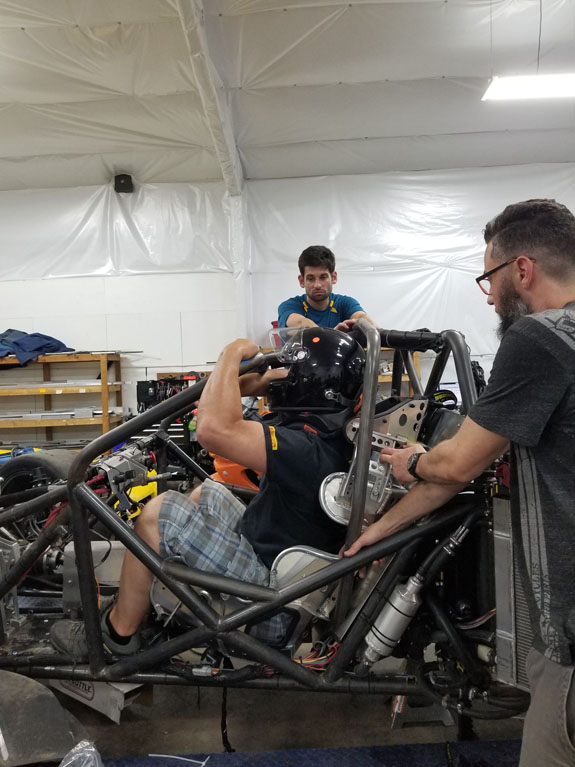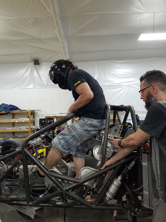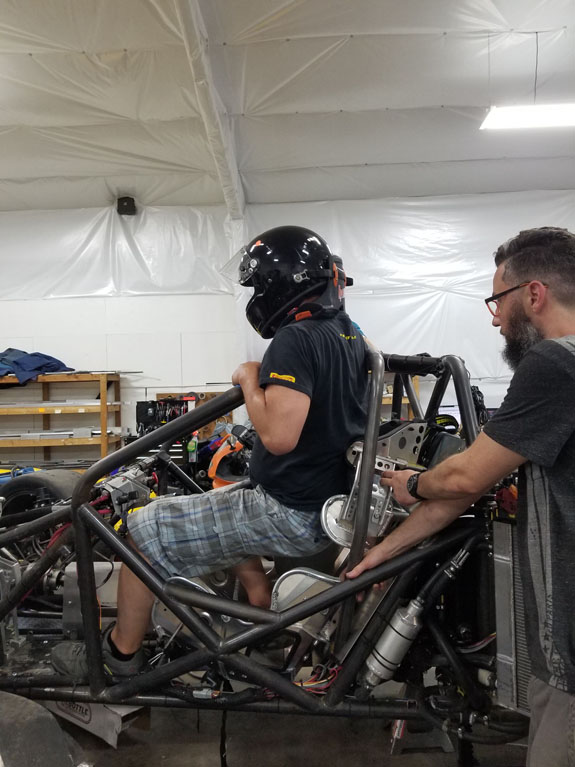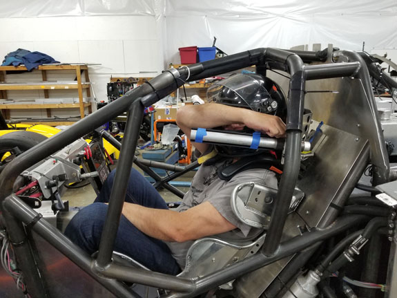 8/6/19 We are supposed to leave Friday early am so that we can start running Saturday. Huge amount of work remains. This is not looking good. Still don't have upper door skins made, but I think I finally figured out the head restraint. Mark fabricates it and it works! Tech approval received.