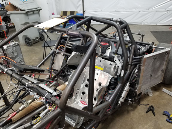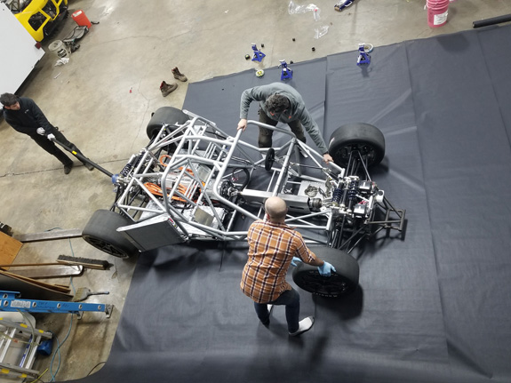 Car 2 chassis assembly. We didn't get it running in time (wasn't needed anyway), but it's a full set of spares and the plan is to display it at Fan Fest. Our partners and sponsors, Cascadia Motion, will transport it with their own van and trailer that are identical to ours (and will be used to transport the finished car when they take possession of it).