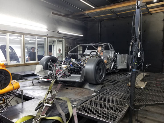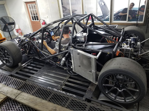 With the cage mods done, getting in and out is possible but even more challenging, even without bodywork. I still don't have a head restraint solution. 3 days to go. We scheduled dyno time for tonight at 8PM at English Racing. As we go to load the car, it does not want to move. After canceling the session, Chris from Cascadia figures out the solution and we're running. I call back to try and get the session done, and Lucas kindly agrees. We are there till almost midnight but do confirm that the battery pack can deliver 1,200+hp for over 45 seconds continuous. This is roughly 14C discharge - those who know batteries will be impressed, since even 'power' packs are usually only rated for 5C for 10 seconds. Temperature range was well within and slightly below expectations. We're good.