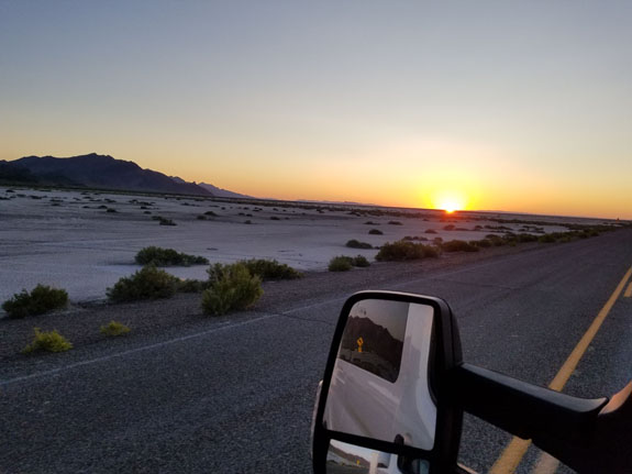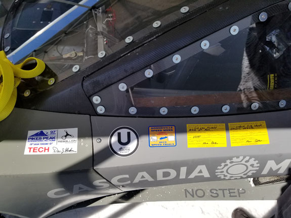 We cut the door in half, bolt the lower half to the bodywork, and make an evolution of the Pikes Peak hack that has a roof-mounted latching button and a hole in the lexan window for the driver to access it. It takes all weekend to get the remaining items sorted so we are way behind but still committed to doing this. We get word that it rained on the flats and first day of racing is postponed till Monday, and then till Tuesday. So we didn't miss anything, yet. 8/11/19 No time to even take pictures, but by the end of the day all is ready and we load up the car and all the gear for the trip. Monday is the 12-hour drive to get to our AirBnB. 8/13/19 After the long drive yesterday, we get up at 4 am to be on the road by 5 for our 100 mile commute. We arrive to a long line of cars waiting to get through the checkpoint. For all of us other than Greg it is the first time here. It's quite the place.