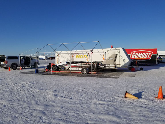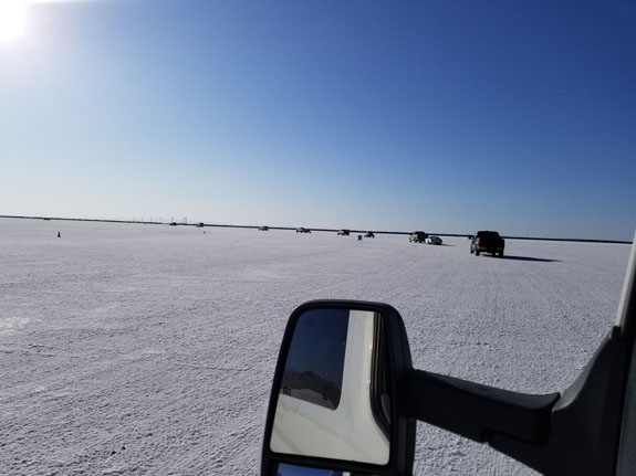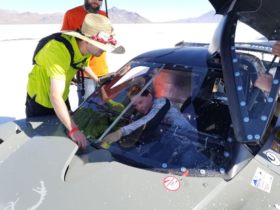 8/15/19 Today is when we are hoping to go for it. First, a run on the short course. When we retrieve Greg he says the speedo showed 197 mph through the trap. Then an official drives over in his truck. 'We seem to be having a computer issue - do you have a speedo? How fast do you think you went?' - 'About 197' - 'Ah, ok then, they said 196+'. 196.960 to be precise. Seems it's a pretty good time for the standing mile in the slush and they wanted to make sure :) Another official later told us she thought it was the fastest run of the meet on the short course, and looking through posted times that appears to be the case (it's a bit confusing looking at the lists because there are also 'short course' runs on the long course, where the competitor has to pull off after 3 miles, so the way to tell an actual short course run is that it will have a 'quarter' speed but no 1 mile or 2 mile speed). One issue is that at about 190mph the lexan windshield popped in, knocking the cockpit camera off its mount. It popped back out as the car slowed down. We'll have to figure out a way to support it before we do another run. At this point our spirits are high and we head over to get in line for the long course. It is not as bad as it was yesterday (some people spent entire day in line without getting to run), but still long. This is all because of the conditions and only having one long course instead of three. But the wait gives us time to figure out windshield support.