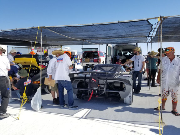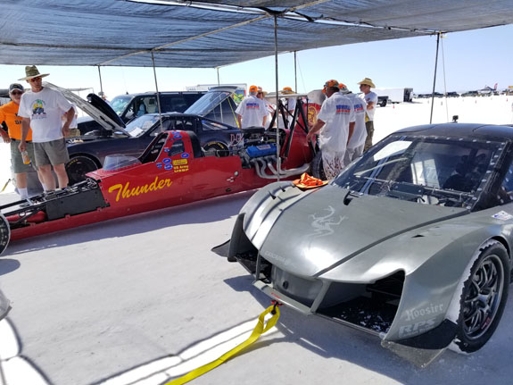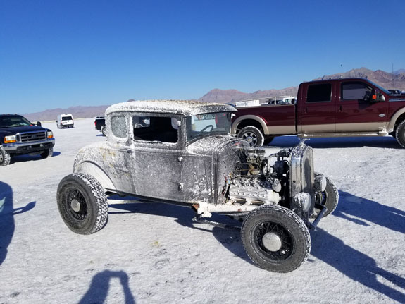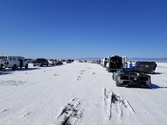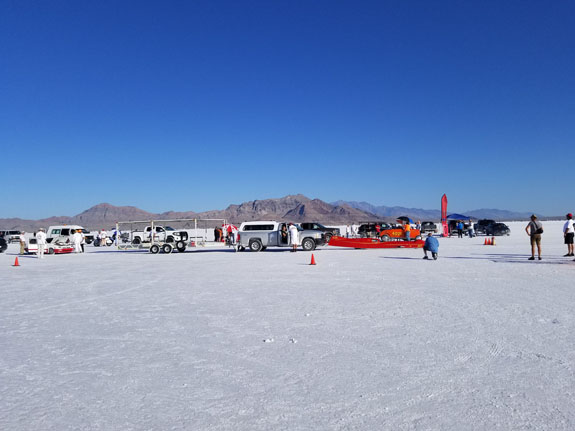 Takes some time, then to find a pit space and set up. Rookie orientation and drivers meeting is at 8am and we barely make that. We are told course conditions are very challenging with the salt still being very wet. Instead of the usual 4-course setup, only two courses are running. The rookie/test short course is only 1 mile (instead of the usual 3), and the single 'long' course is 4 miles instead of normal 6. There is an amazing variety of machinery here, both racers and just random hotrods driven by spectators.