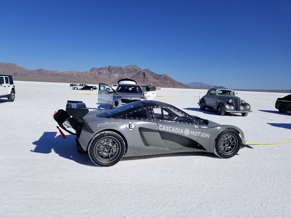 We do two more passes, at 167 and 174 mph, working up to speed cautiously. No issues so far although the salt is rough and wet. This is a one-mile, rather slushy course so we are told it's pretty good for the conditions. We are also told that the water table is just below the surface and rises throughout the day as the temperature goes up. So it's considerably wetter the later in the day we go. The car does kick up quite a bit of salt with the aero. Just like Pikes Peak, earlier in the day is better. We tried charging from the generator we brought but the charger keeps shutting down after 20-30 seconds (we had only tested it for maybe 5 seconds back at the shop to verify functionality, guess should have been more thorough). So that is a problem we need to solve since we are now at about 80% charge and a long top-speed run will take a lot more than the short ones have been taking. We also have to check out from the AirBnB tomorrow since it was originally booked when we were going to start racing on the 10th, and I wasn't able to extend the stay. I did find another one that became available in Wendover. So no more 100 mile commute. And, it has an electric stove! Charging problem solved.